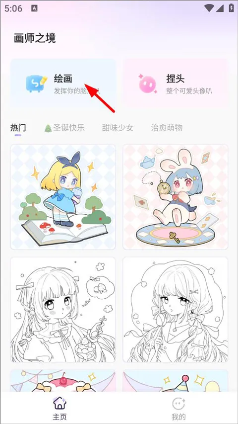 1、用户打开画师之境app,登录进入主页,主页中有各种热门、治愈、甜味素材,用户可选择喜欢的进行涂色,点击左上角绘画;