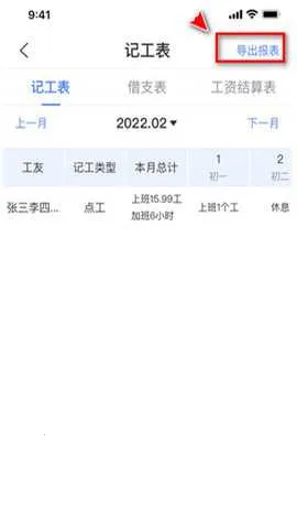 4、在记工表中找到导出报表并进入。