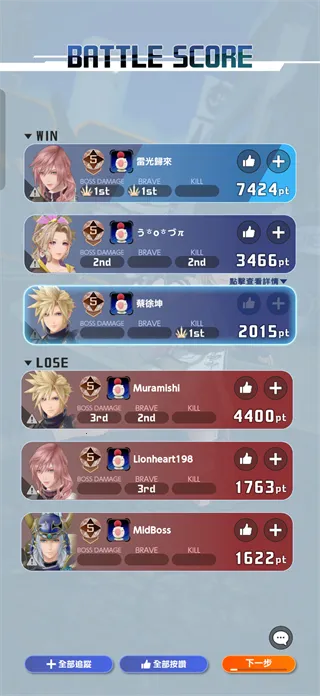 3、通过不断积攒勇气值消耗boss血量,最后率先击杀boss的队伍获胜,要注意击败玩家只是延缓他们进度,击败boss才是胜利目标。