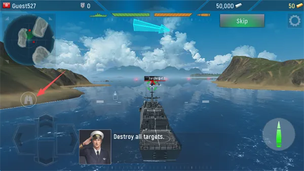 1、屏幕左下角的操控盘可以控制舰船的移动方向,前减和后退是按照档位机制的,屏幕右侧可以控制视角的移动,空中有时会掉落弹药、维修等道具。