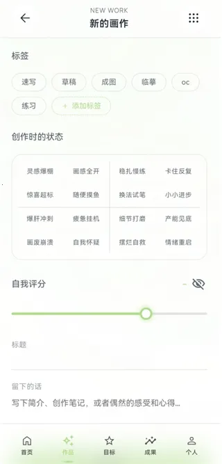 3、滑到最底下可以给这张画添加标签、创作时的状态、自我评价、标题等内容,都设置好后点击保存。